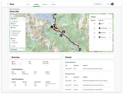 Looking over hundreds of thousands of acres of wilderness is no small task. Talus gives rangers a spatial view of their data, enabling them to better interpret and act on what they see, and reduce redundancy in which issues are reported.